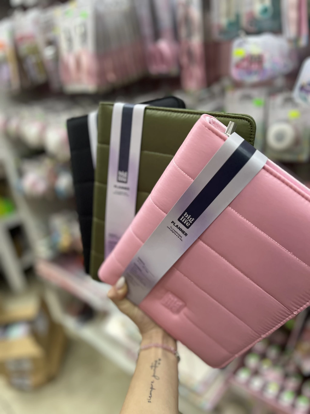 Agenda efecto puffer, con cierre. En su interior un sistema de discos que te permite agregar y sacar hojas a tu gusto pudiendo ultilizar de esta forma la carpeta por varios años ya sea como agenda o luego como cuaderno agregando repuesto de hojas con renglones por ejemplo.