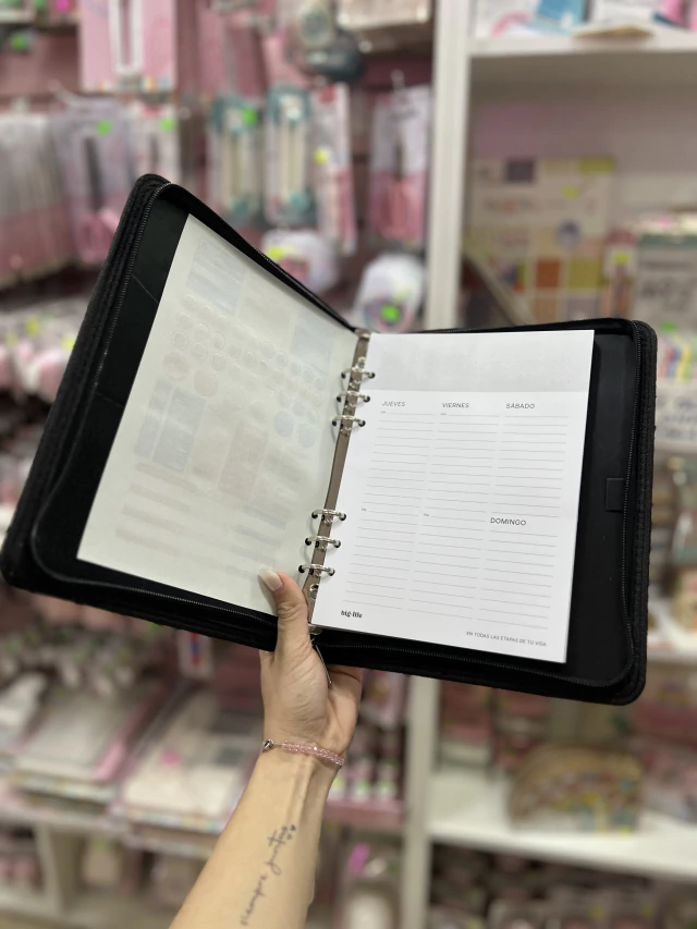 Incluye compartimentos para usar como sobre y un espacio para llevar una lapicera siempre contigo. Incluye una plancha de stickers, hojas para planificar un año completo con distribucion semanal y ademas varias hojas de notas con renglones.