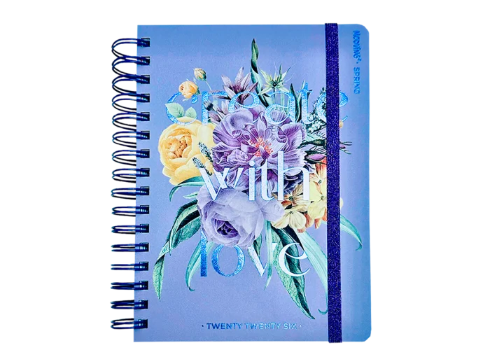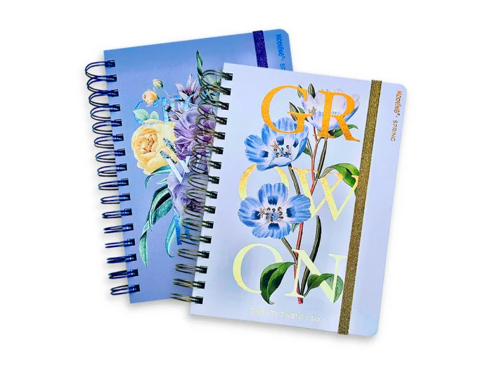 Agenda Mooving Spring 2026 diaria, combina estilo y funcionalidad .Se presenta en dos diseños con mensajes inspiradores: uno con la frase “Grow on” y otro con “Create with love”, ambos acompañados por una estética fresca.