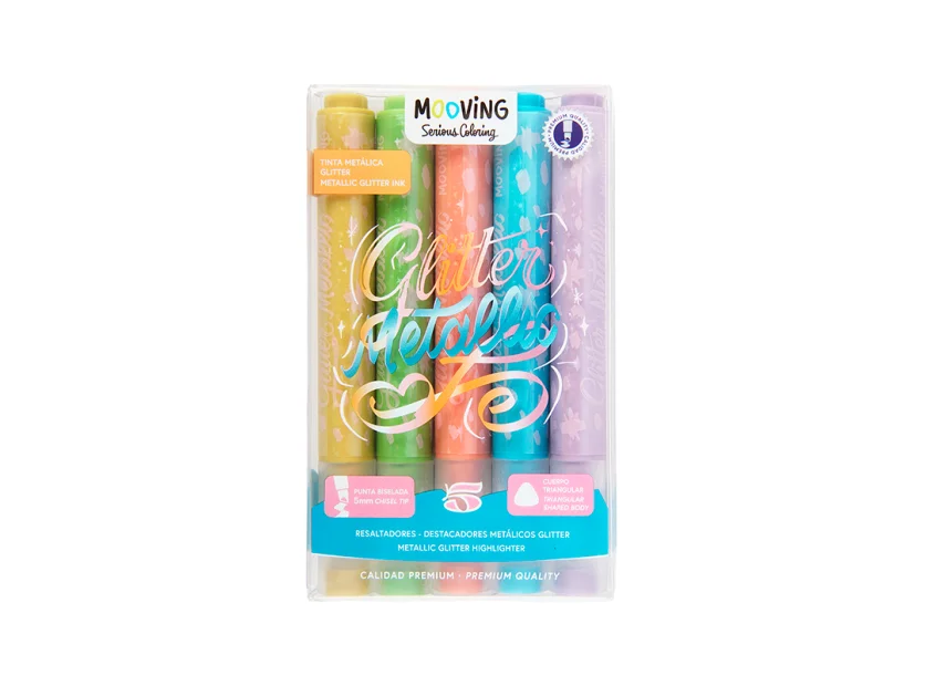 Set de resaltadores metálicos Mooving con tinta glitter que aporta brillo y color a cada trazo. Ideales para subrayar, decorar y destacar con estilo y comodidad.